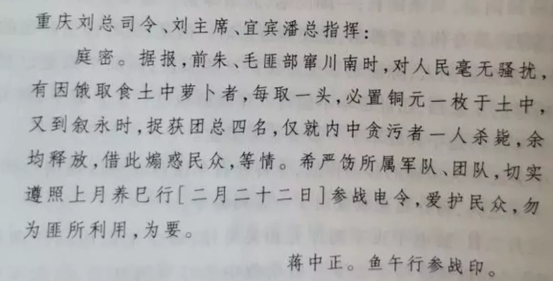 他還羨慕紅軍的紀律和作風,他曾經在給川軍劉湘的信中寫道:“朱、毛匪部竄川南時,對人民毫無騷擾,有因餓取食土中蘿蔔者,每取一頭,必置銅元一枚於土中,又到敍永時,捉獲團總四名,僅就內中貪污者一人殺斃,餘皆釋放……”