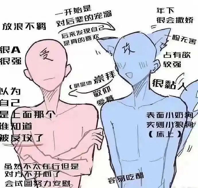 很多人一開始畫同人的時候無從下手,有資深畫師就會畫一些無臉小人的動作示範,給大家參看用,這種範畫就是攻受小人/ab小人。