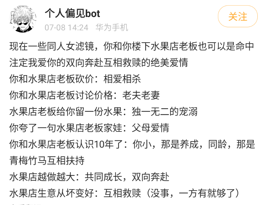 曾幾何時,同人女們苦等產糧太太更文,三五天才能吃到一口飯,現在打開代餐bot,你想看你cp幹什麼都能找到大差不差的代餐。