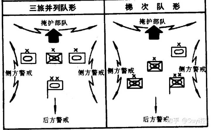 在其之後,師展開兩個側翼旅。側翼旅的各營採用斜線隊形:左翼旅展開左斜線隊,右翼旅展開右斜線隊,和矛尖旅一起拱衞中央的師非一線作戰力量。