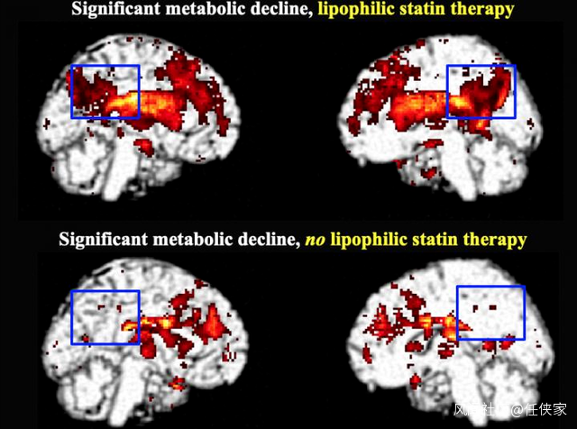 另外,研究人員發現,長此以往,服用親脂性他汀類藥物患者的 PET 成像也顯示,大腦後扣帶回皮層(大腦扣帶皮層的尾部,位於前扣帶皮層之後)的代謝顯著下降,該區域在阿爾茨海默病的早期階段下降最顯著。