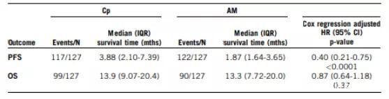 療效分析:PFS 和 OS 結果見表 1。Cp 組 PFS 產長,但兩組 OS 沒有達到統計學差異。