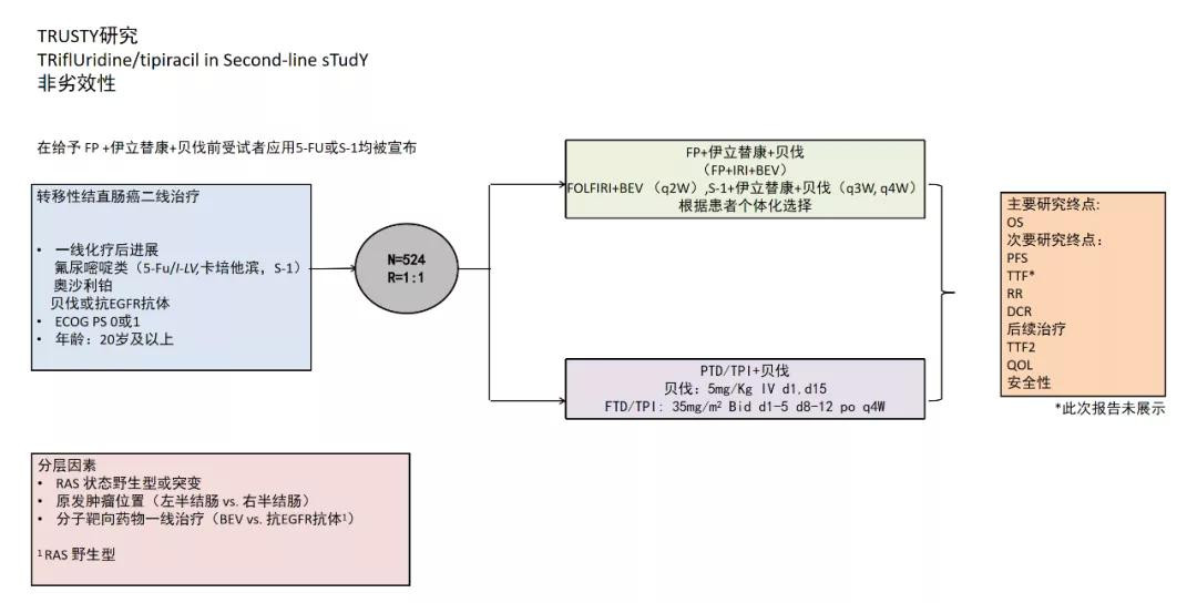 曲氟尿苷複方片 (Trifluridine/tipiracil, FTD/TPI) 聯合貝伐珠單抗(BEV)對比伊利替康+氟尿嘧啶聯合 BEV 二線治療 mCRC 的隨機 II/III 期研究:TRUSTY 研究結果
