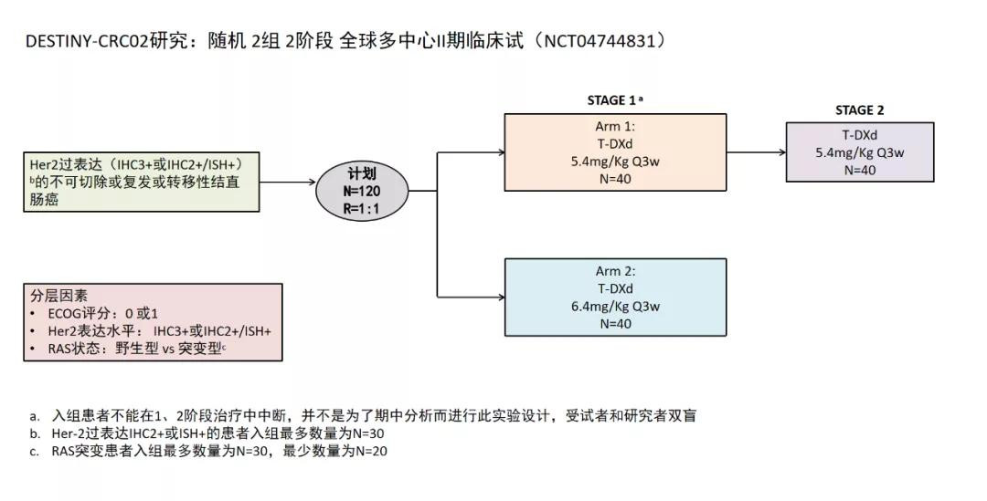 入組經中心實驗室證實為 HER2 表達、RAS 野生型 mCRC,≥ 2 種治療方案後進展的患者。分為 3 個隊列,A:HER2 IHC 3+或 IHC 2+/ISH+;B:IHC 2+/ISH-;C:IHC 1 +。給與 DS-8201 6.4 mg/kg, Q3w。隊列 A 的主要終點為獨立評審中心證實的客觀緩解率(ORR)。次要終點為疾病控制率(DCR)、緩解持續時間(DOR)、PFS 和 OS。