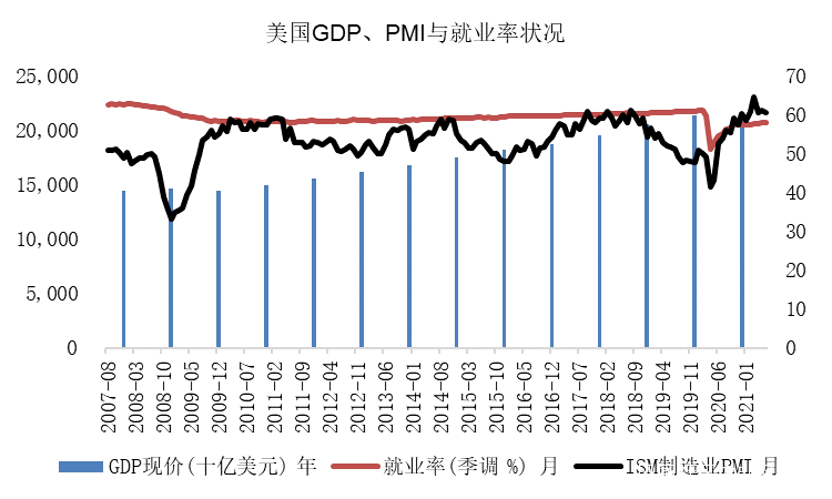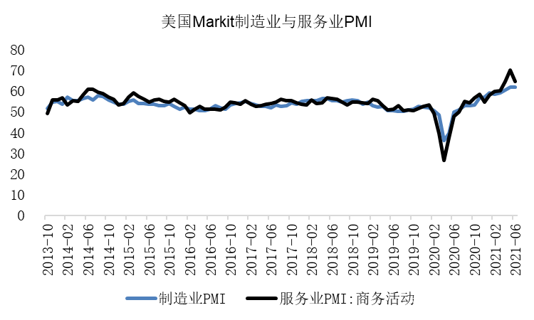 從製造業PMI及服務業商業活動PMI來看,國內經濟復甦情況還是較好的,基於不斷復甦的經濟,美聯儲6月對實際GDP增速的預測值也從3月宣佈的6.5%提高到了7.0%。