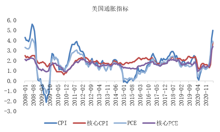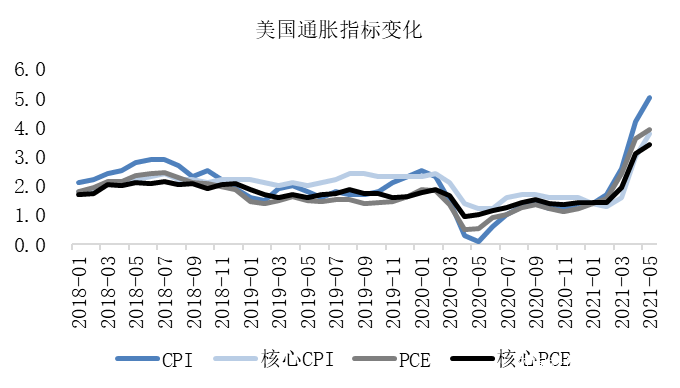 從CPI、PCE來看美國通脹狀況,數值也達到了預期的,甚至脹過了頭。從5月數據來看,不管是CPI、核心CPI還是核心PCE,都創下了2008年金融危機以來的新紀錄。如5月份CPI、PCE的當月同比分別為5%、3.91%,遠超通脹目標2%數值。