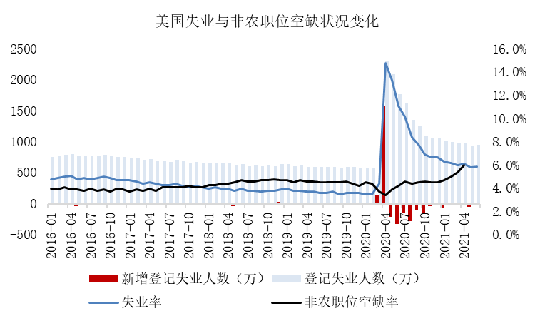 隨着寬鬆貨幣政策的執行,國內失業率從2020年4月的14.8%逐步下降至2021年6月的5.9%,距離3月美聯儲公佈的2021年失業率預測值4.5%仍有較大距離。所以6月該數值的預測並沒有調低,美國的就業率仍需要寬鬆貨幣政策的支持。