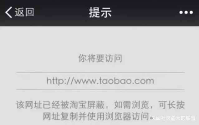 於是,戰火一觸即發。微信隨即停止將淘寶相關鏈接導向淘寶網站,代之以直接提示用户,要訪問的網址“已經被淘寶屏蔽”。