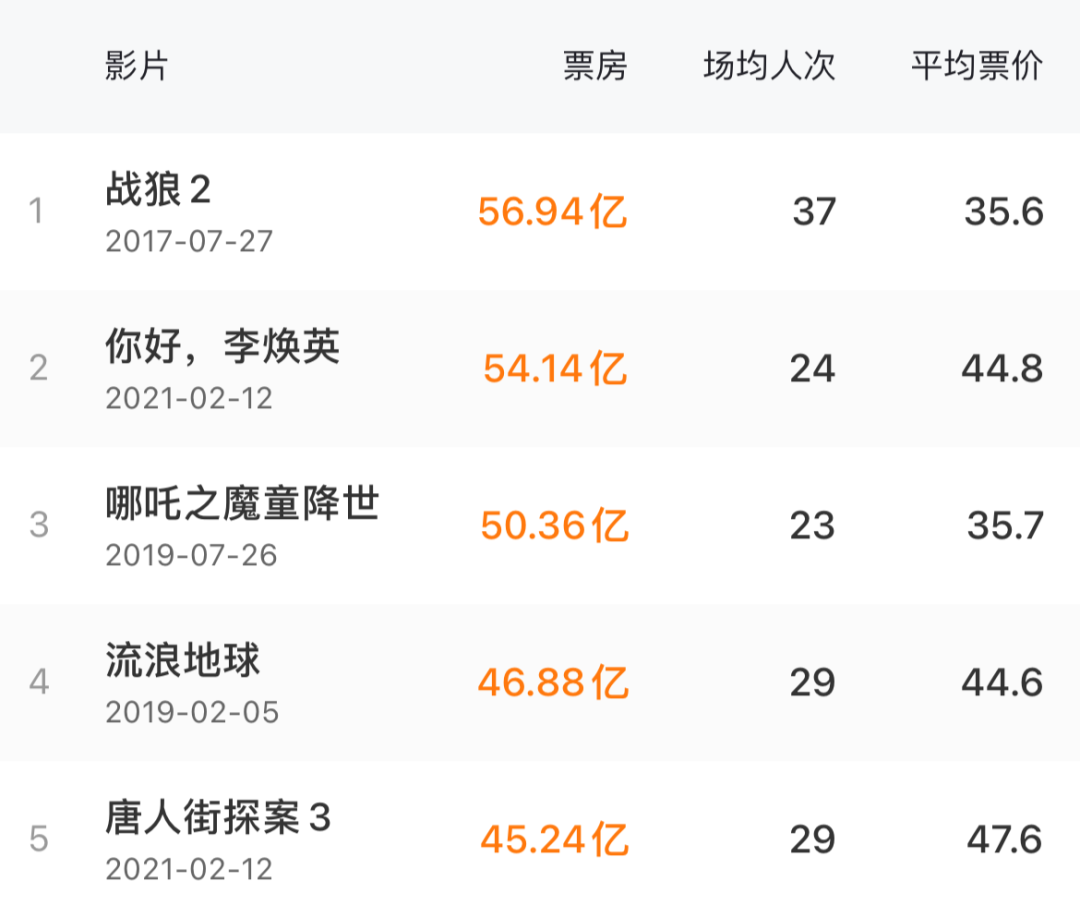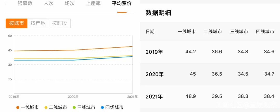 觀影人次大幅度降低最直接的原因便是逐漸抬高的票價。2021年上半年平均票價為40.5元,比2019年同期增長近2元。其中,春節檔平均票價上漲4.2元、元旦檔上漲2元、清明節上漲2.1元,而五一檔則因好萊塢大片缺位下降5.7元。