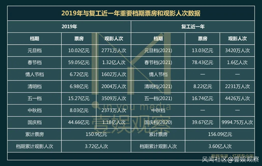 雖然直接將跨年數據與單年數據相類比並不科學,且把影院復工初期恢復的數據放入其中也有失偏頗。但在復工一週年之中,所有重大檔期都有所包含,今年的元旦、春節、五一等檔期均創下歷史紀錄,即使對比2019年的最強國慶檔,在2020年也只落後不到5億元票房。而且,如果不能提高自我要求,直面市場問題,對於衝擊更高票房成績也非正確心態。