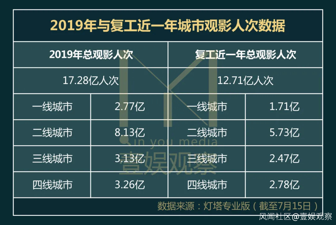 如果再將數字精確計算至7月19日,進入7月,工作日平均觀影人次為250萬,週末為500萬,未來四天可以按照1400萬人次計算,那累計就達到12.84億觀影人次,同比於2019年的17.28億觀影人次,近一年電影市場損失了接近於4.5億的觀影人次。