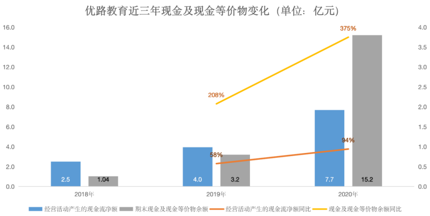 截至2020年末,優路教育持有的現金及現金等價物餘額達近三年最高值,為15.2億元,同比增長375%。經營活動產生的現金流淨額為7.7億元,同比增長94%。
