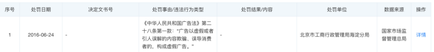 天眼查顯示,2016年,環球優路因虛假廣告被北京市工商行政局海淀分局處罰。