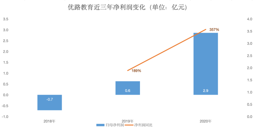 淨利潤方面也表現出同樣的趨勢。近三年,優路教育共計盈利2.8億元。2020年淨利潤達近三年最高值,實現2.9億元,同比增長357%。疫情之下年賺3億,實實在在的“不差錢”。