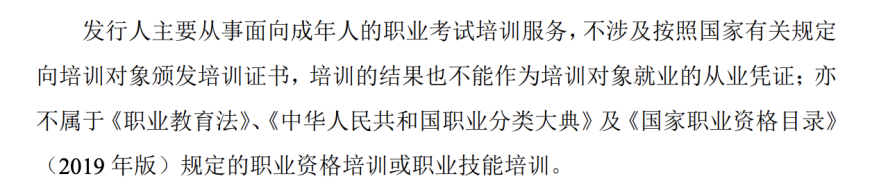 在招股書中,優路教育表示,其主要從事面向成年人的職業考試培訓服務,不涉及按照國家有關規定向培訓對象頒發培訓證書,培訓的結果也不能作為培訓對象就業的從業憑證。
