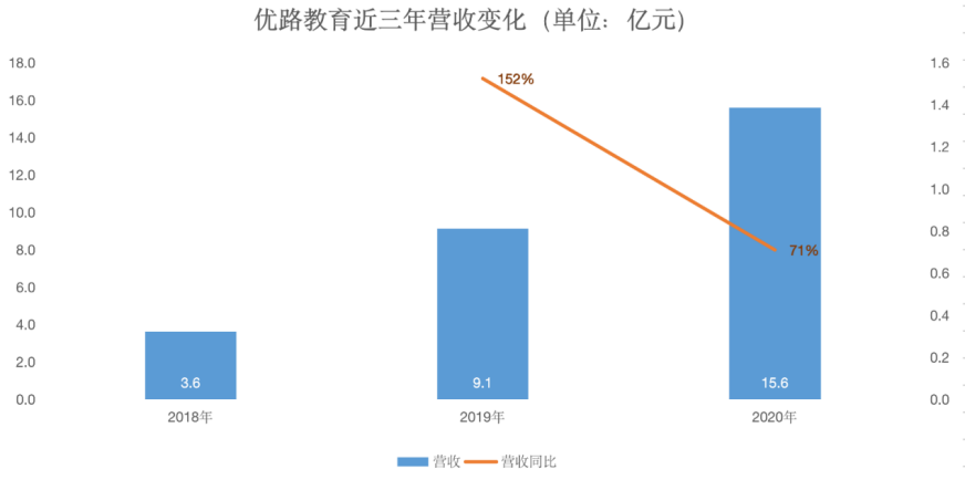 近三年以來,優路教育營收呈現大幅上漲的趨勢,共計營收28.3億元。其中,2019年營收9.1億元,同比增長152%。2020年營收達近三年最高值,實現15.6億元,同比增長超70%。