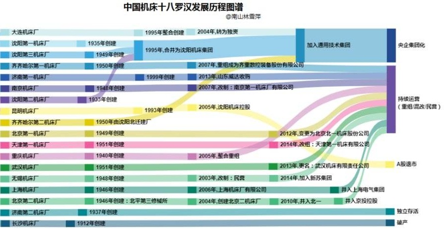 從建國初中國機牀界的“十八羅漢”,到後來兼併重組後碩果僅存的“四大金剛”——瀋陽機牀、大連機牀、昆明機牀(後被沈機併購)和秦川機牀,再到如今,只剩下秦川機牀在獨木強撐,中國機牀業岌岌可危之相,可見一斑。