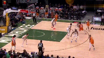 第二件事是,雄鹿上線防守人應對掩護牆時,增加了繞防。按説這種選擇在對付持球投大神時非常冒險,但因為保羅布克都更喜歡投16英尺以內的中距離,這使得繞防之後還是有機會追回位置。