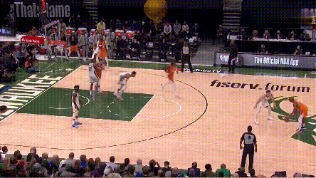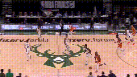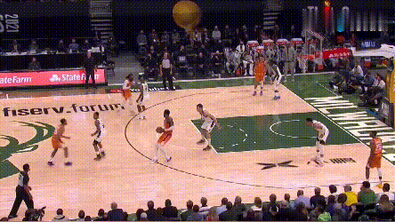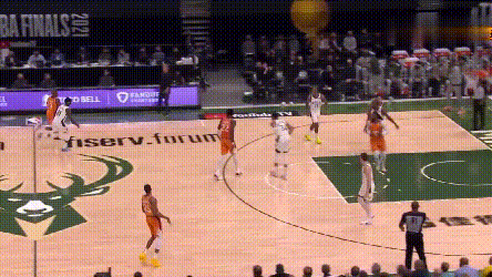 第一件事是,字母防艾頓的時候,防擋拆的效果提升了。只要大洛不在,不管內線搭檔是波蒂斯還是塔克,字母都會直接對位艾頓。之前雄鹿解決不了的問題是,字母換防後,其他人被艾頓懲罰,G4這件事發生了改變,除了雄鹿自己不再換防時嘗試繞前被吊身後,身邊的協防做得更好,以及字母送出了可以成為他職業生涯標籤畫面的驚天大冒之外,太陽在進攻端犯的錯誤也幫了雄鹿,這點我們後文再説;
