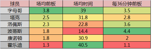 下表是這輪系列賽,雄鹿主要輪換球員除米豆之外的前板數據: