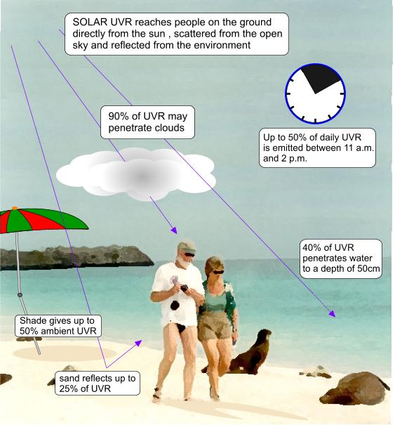 海邊空氣質量較好,陽光在大氣中的穿透率一般高於內陸城市,因此人體接受的紫外線輻射量一般會比日常強烈。一般在海邊,90%以上的紫外線會直達皮膚,而且50%的紫外線能量會集中在11點至下午兩點之間。