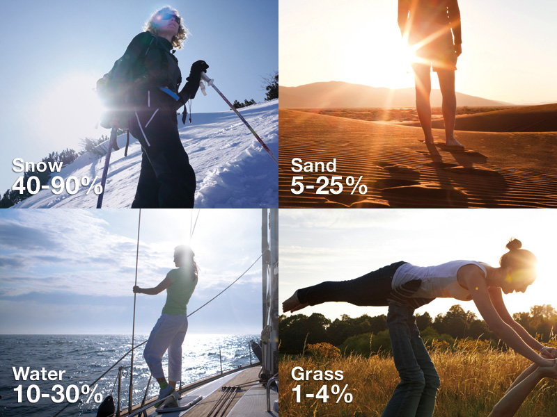紫外線對我們皮膚的輻射強度,不僅取決於直射皮膚的紫外線強度,同時取決於紫外線到達地面的反射面。