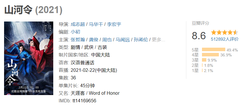 優酷手握2021耽改第一爆款《山河令》,在上半年出盡風頭。這是今年的“耽改第一槍”,也是目前為止的唯一一槍。“夏日限定”的缺席,與“七一”獻禮季不無關係。但綜合來看,即便接下來《皓衣行》《烽火流金》順利播出,也不影響《山河令》已成爆款的既定事實。