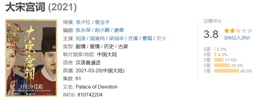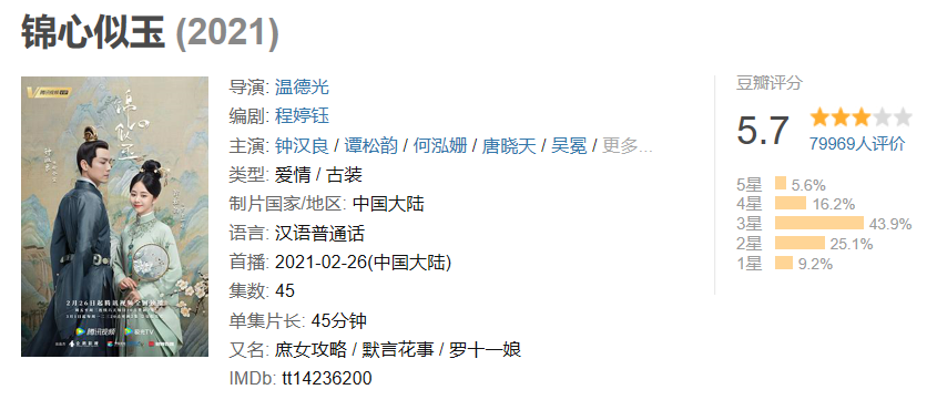 以豆瓣2021年上新電視劇詞條為參考標準,1——6月份累計上線國產電視劇149部。其中,6分以下電視劇55部,7分以上口碑劇24部,評分人數不足電視劇48部。由此統計,2021年上半年豆瓣開分6分以上電視劇僅46部,佔比僅30%。