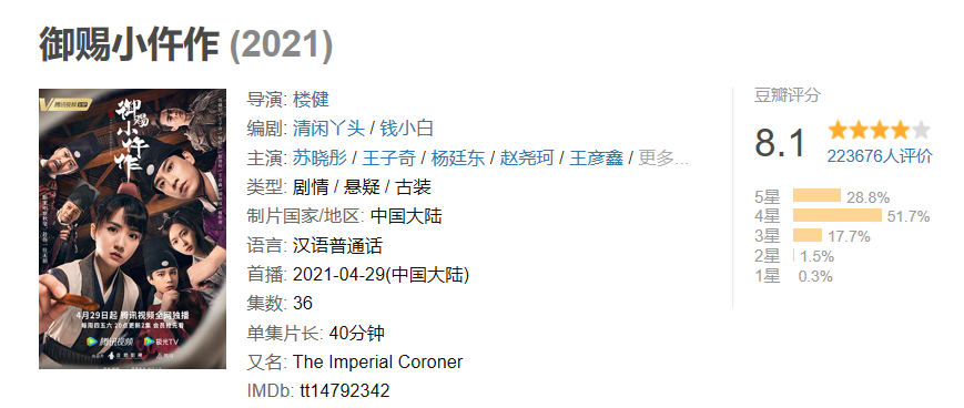 《御賜小仵作》豆瓣評分8.1,位列上半年國產劇第7,評分人數22萬+