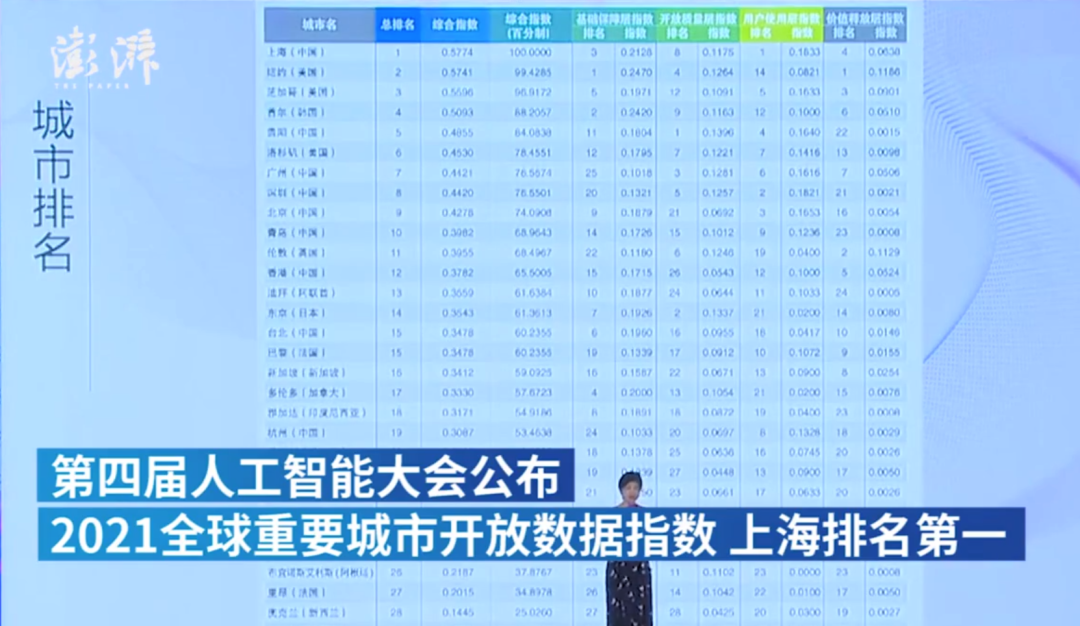根據上海社會科學院綠色數字化發展研究中心發佈的《2021全球重要城市開放數據指數》,上海蟬聯全球重要城市開放數據指數的冠軍。