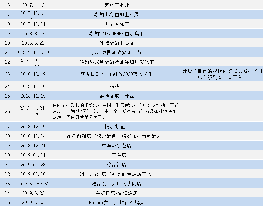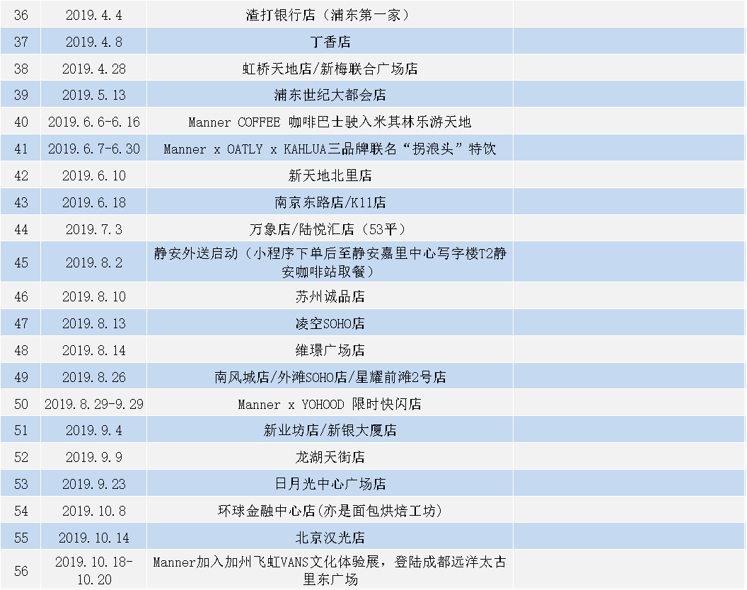 盒飯財經(ID:daxiongfan)將Manner咖啡的發展大事記做了梳理。梳理發現這樣的密集開店,始於2018年10月,Manner獲得來自今日資本的8000萬A輪融資。融資後兩個月,Manner在上海開出5家分店。2019年全年,Manner開店48家,平均每個月都有2家店開業。