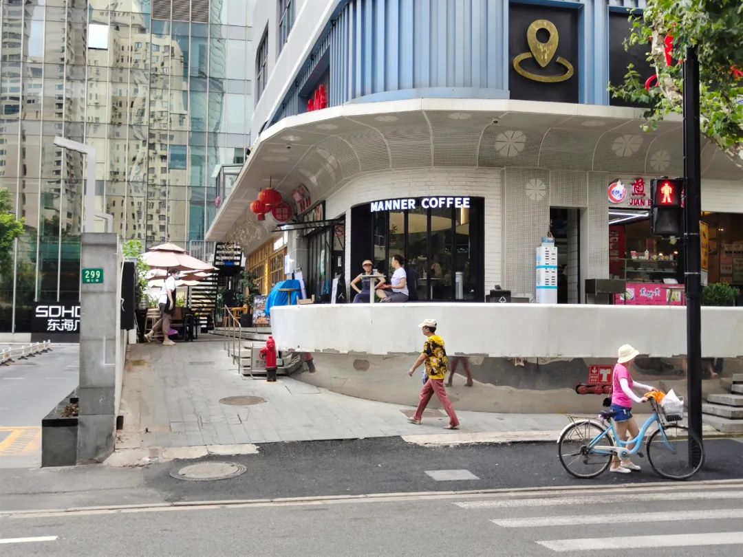 服裝店、早餐店、居民樓單元門逐個搜尋,沿着導航在這條街來回三遍後,我們才找到了此行的目的地——位於上海靜安區南陽路205號的Manner咖啡首店。