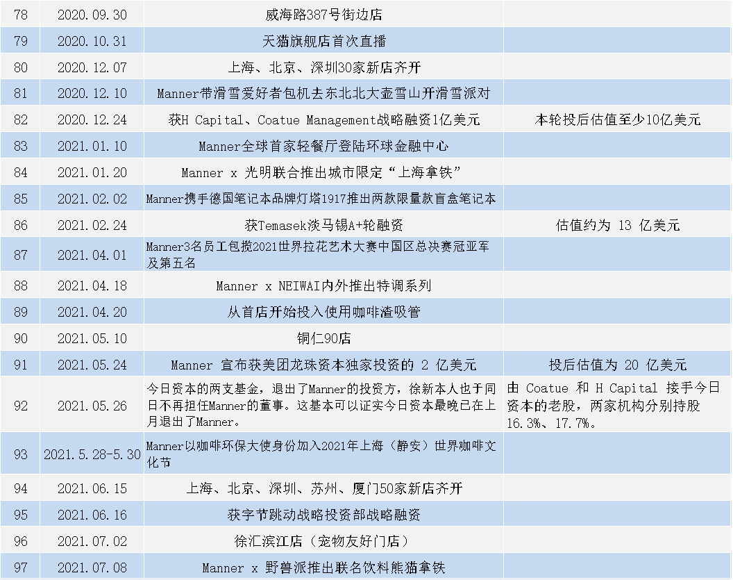 據36氪報道,6月16日,中國本土精品咖啡品牌“Manner”完成新一輪融資,字節跳動成為新投資人。這是繼上個月美團龍珠投資後,它在短短6個月內完成的第4次融資。除字節跳動和美團龍珠外,Manner的股東陣容還包括“風投女王”徐新掌舵的今日資本、前老虎基金全球合夥人陳小紅髮起成立的私募基金H capital、對沖基金Coatue以及新加坡主權投資基金淡馬錫。