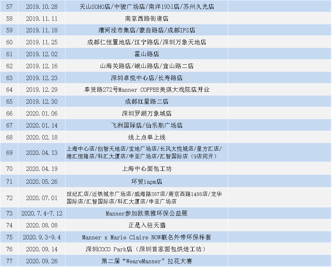 2020年,Manner持續加速。全年開店54家,其中4月13日,上海共有9家分店同時開業,12月7日,上海、北京、深圳3地共30家店同時開業。