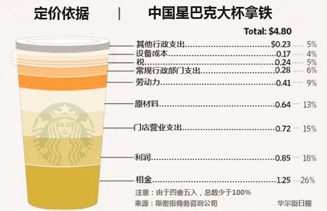 《華爾街日報》根據星巴克的年報,繪製了一幅中國星巴克大杯拿鐵定價依據圖,我們可以清楚看到,佔比星巴克大杯拿鐵價格構成最大的,是租金一項,佔26%,其次是門店營業支出,佔15%,第三是原材料佔13%,緊接着是勞動力佔9%。