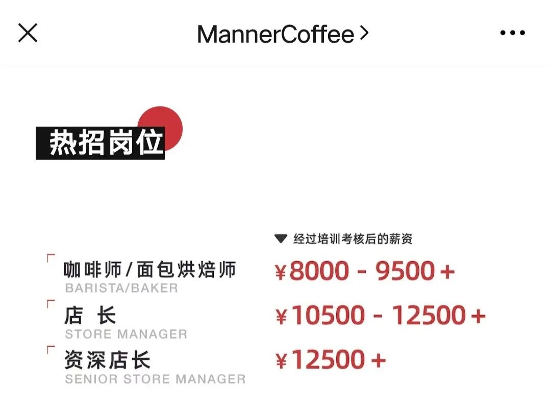 上海星巴克店長的工資在8600元左右,與Manner動輒上萬的月薪相比,差距正在逐漸拉大。據瞭解,2016年的Manner只招得起學徒,招聘要求也只有“對咖啡有熱情”。而這類學徒的薪資,目前一線城市基本為4-5K。