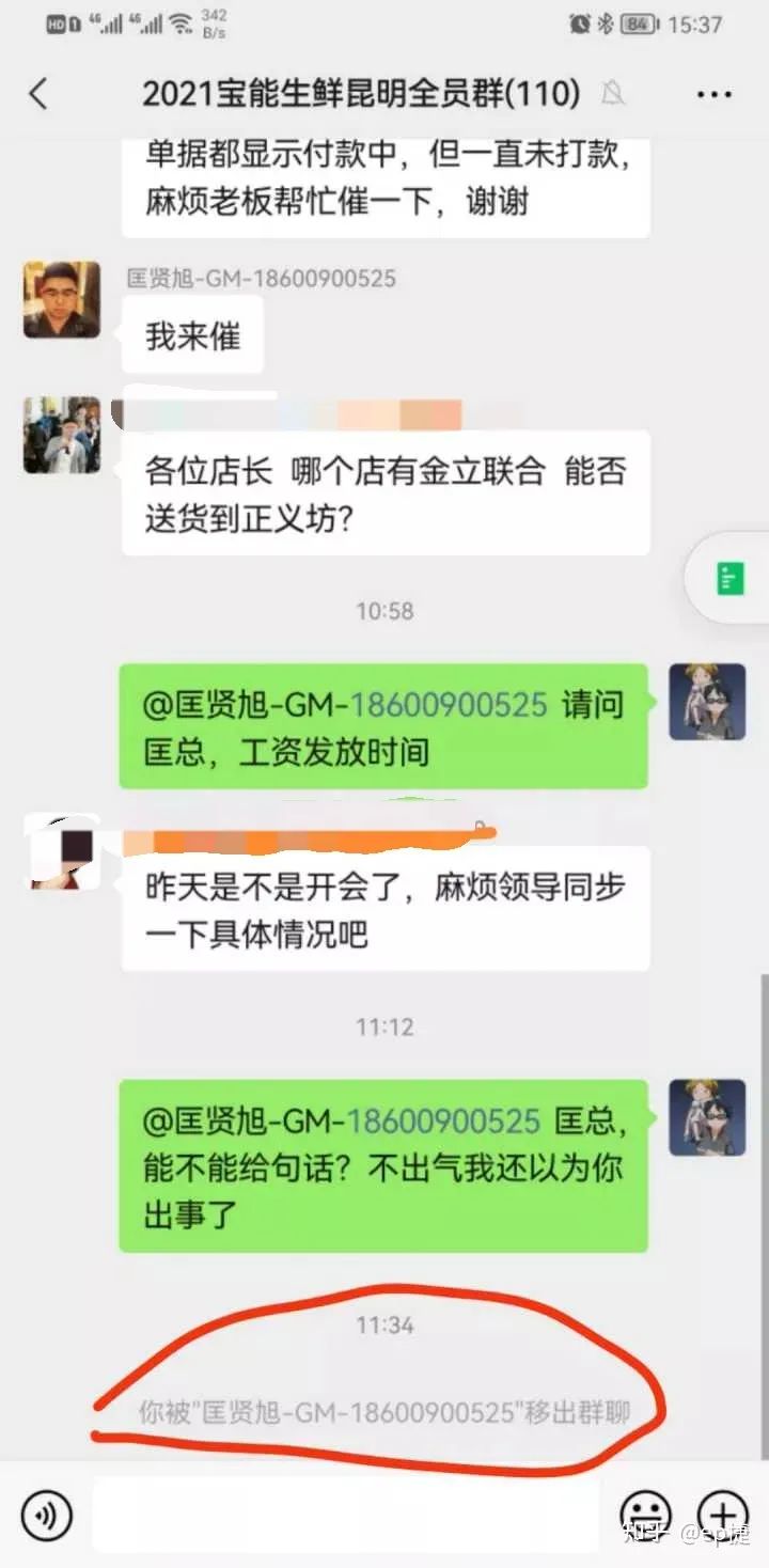 昆明寶能生鮮的員工在工作羣問工資發放時間,並艾特城市總。一刻鐘後,見剛剛還活躍的領導沒有回話,這位員工再次詢問“能不能給句話?不出氣我以為你出事了”。
