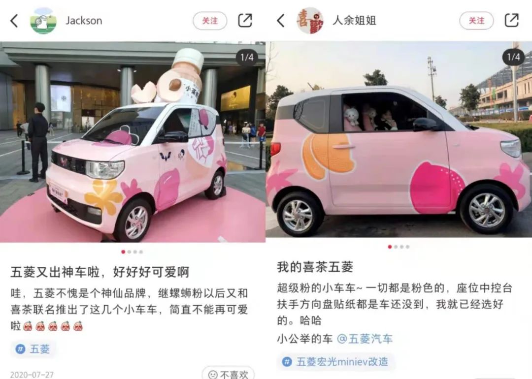 去年7月,喜茶官宣和五菱宏光MINIEV聯名,推出奶茶款的五菱汽車,迷你可愛的粉色外觀一時間刷屏各大社交網站,話題度十足。