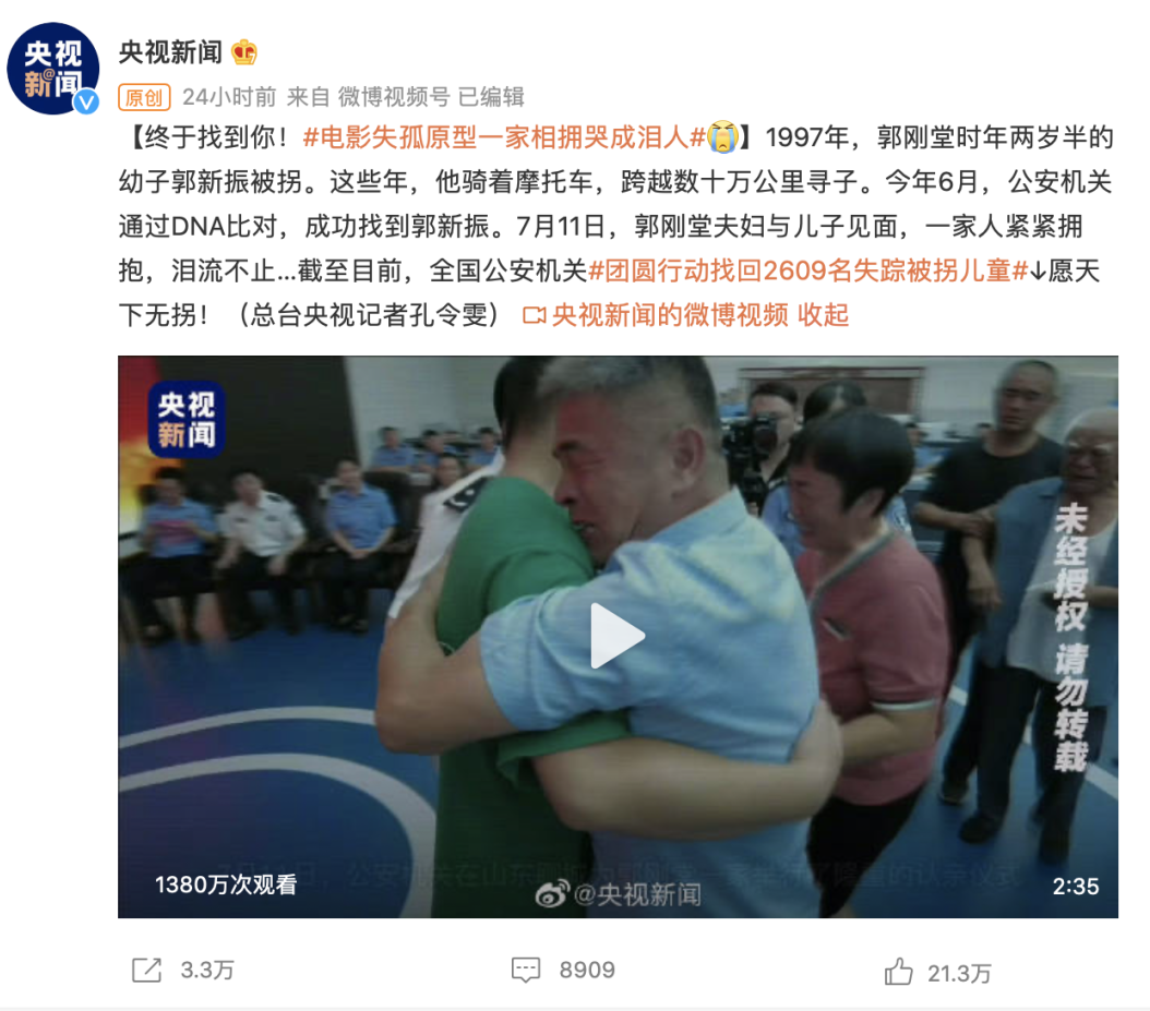「電影《失孤》的原型郭剛堂被拐賣的兒子已經找到。」