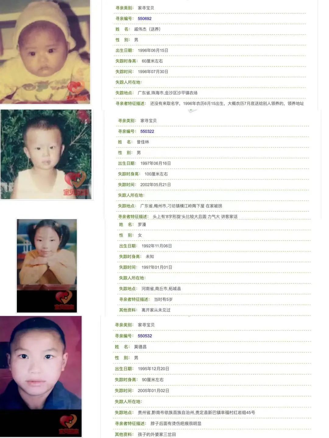 在尋找被拐兒童的網站「寶貝回家」裏,她姐整理截取了部分被拐兒童的資料信息。