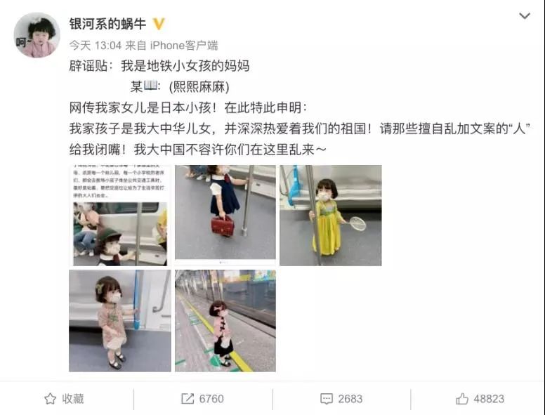 名為“銀河系的蝸牛”的播主正義凜然地宣告:“網傳我家女兒是日本小孩!在此特此申明:我家孩子是我大中華兒女,並深深熱愛着我們的祖國!請那些擅自亂加文案的‘人’給我閉嘴!我大中國不容許你在這裏胡來。”愛國錚錚,僅至截圖時,已獲48823個贊。