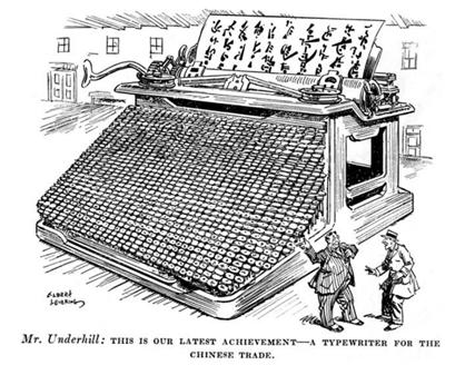 他們在笑話中文的 “ 落後 ”,有成千上萬的字符,要是中文打字機被髮明出來了,用起來肯定就是如畫面中描述的那麼不便。