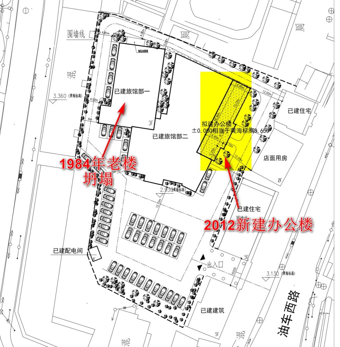 當我看見這張總圖的時候,我就全明白了。為什麼我一直覺得看坍塌樓體的包漿,那個顏色怎麼看怎麼不像新樓,現在有了確鑿證據後,才知道這個坍塌樓體跟2012年接建辦公樓並不是同一個樓,跟設計單位和施工單位完全沒有關係。
