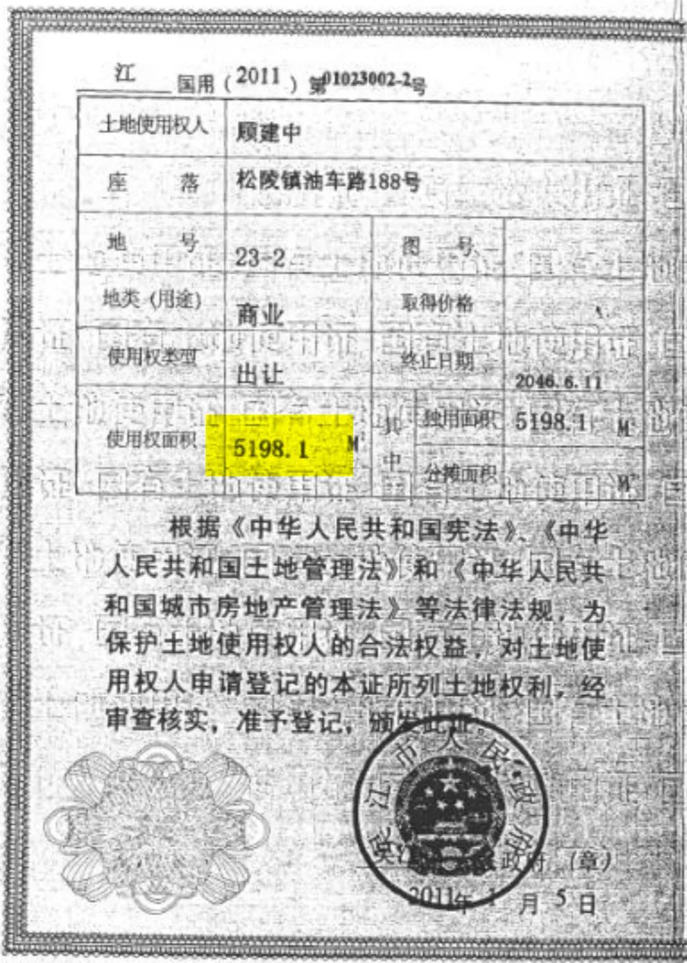 土地證上,同樣是5198.1平方米