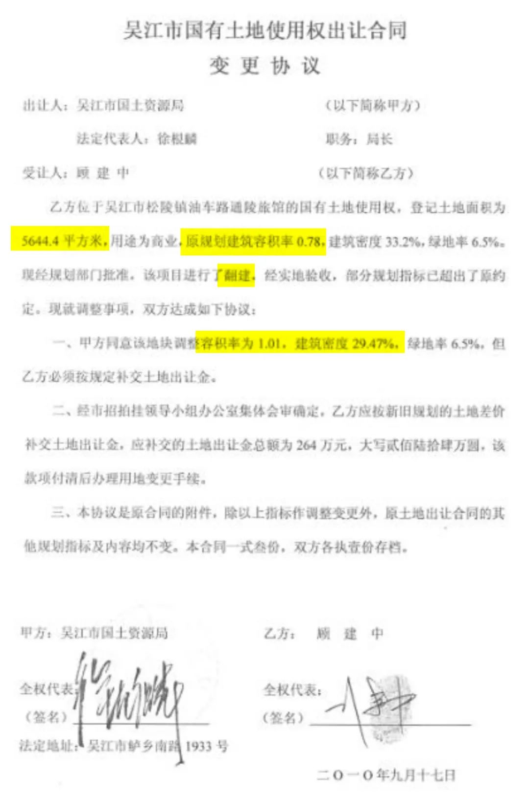 但是在《吳江市國有土地使用權出讓合同變更協議》上,這塊地的面積又變成了5644.4平方米。這中間的差到底去哪裏了?經規劃部門批准,該項目進行了翻建,規劃指標超出了原規定——到底翻建了什麼?