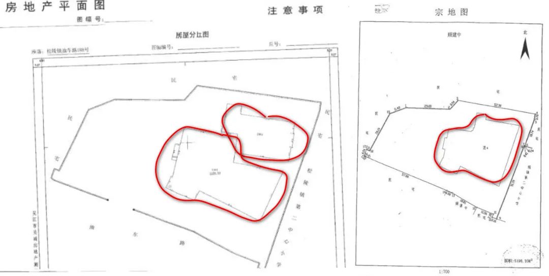 因為坍塌的旅館,就是總圖左上角這個「已建旅館部一」。據傳就是1984年建成的(看包漿,傳聞相對可信),所以才會採用老掉牙的24磚牆+預製板工藝,3層,面積也不大,畢竟那個年代大家都沒錢。對比看了房產證,的確有兩棟房屋,而這兩棟房屋跟宗地圖上也是能匹配上的。
