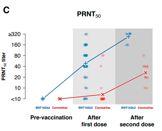 這篇來自香港大學的研究報告了在醫務人員中使用mRNA疫苗BNT162b2和滅活疫苗Coronavac的結果。本研究為隊列研究,納入1442名來自香港各公、私立醫院和診所等機構的醫務工作者,分別採集其未接種前的血樣、接種第二針前的血樣以及接種第二針後21-35天的血樣。最後,完整收集到全部數據的樣本為93人,其中63人接種mRNA疫苗,30人接種滅活疫苗。