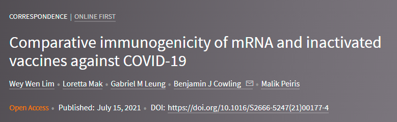 4.Comparative immunogenicity of mRNA and inactivated vaccines against COVID-19.Published:July 15,2021DOI:https://doi.org/10.1016/S2666-5247(21)00177-4