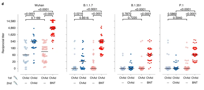 3.Barros-Martins,J.,Hammerschmidt,S.I.,Cossmann,A.et al.Immune responses against SARS-CoV-2 variants after heterologous and homologous ChAdOx1 nCoV-19/BNT162b2 vaccination.Nat Med(2021).https%3A//doi.org/10.1038/s41591-021-01449-9