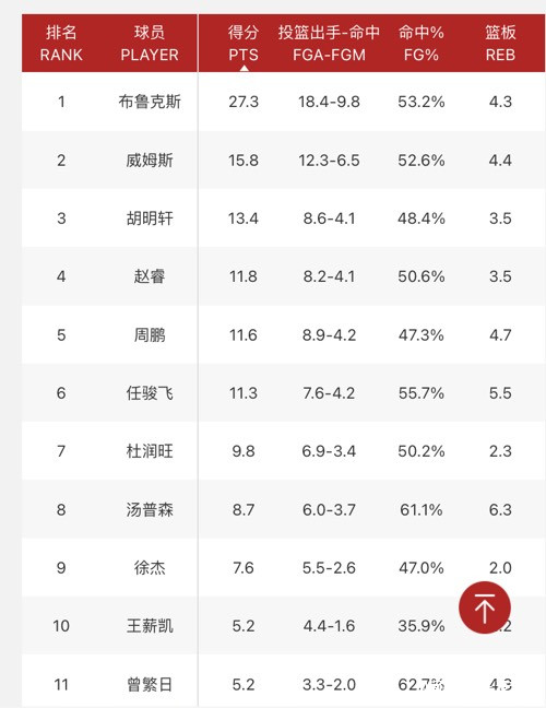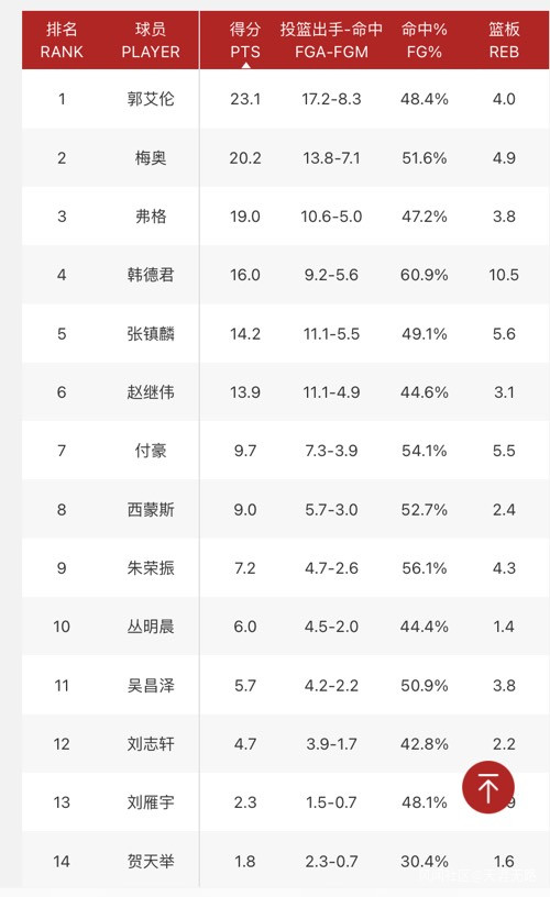 而最後的冠軍廣東隊採用了五上五下策略,全體球員平分上場時間,結果在易建聯缺陣的情況下,廣東隊還是拿到了聯賽第一。除了效率極高的布魯克斯,上賽季的fmvp威姆斯的數據也不算特別恐怖:15.8分,這數據放眼整個聯盟都算不上突出。僅比這次落選賽發揮最好且後來成為fmvp的胡明軒高2分。